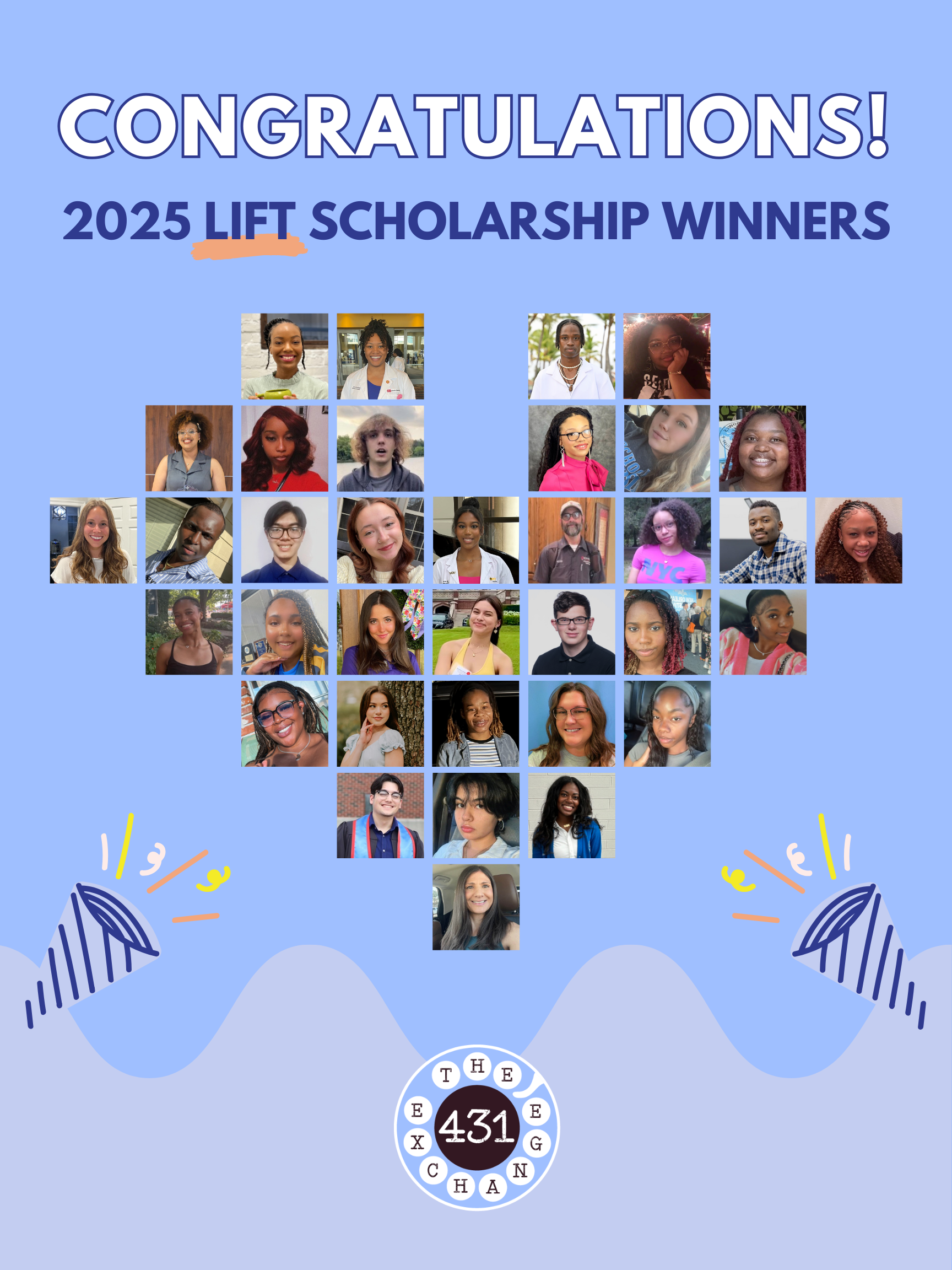 We’re proud to announce our 35 new LIFT Scholarship winners for 2025! These remarkable students—ranging from certificate and associate programs to doctoral studies—have earned this milestone award by taking bold next steps in their academic journeys. Among this year’s winners are future nurses, engineers, psychologists, and educators who are pushing forward despite financial and personal challenges. From securing clinical placements and research opportunities to preparing for graduation and professional licensure, each scholar embodies perseverance, excellence, and hope. Their progress reminds us why the 431 Exchange is committed not just to opening doors, but to walking alongside our scholars every step of the way.